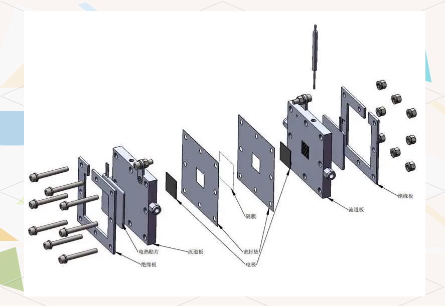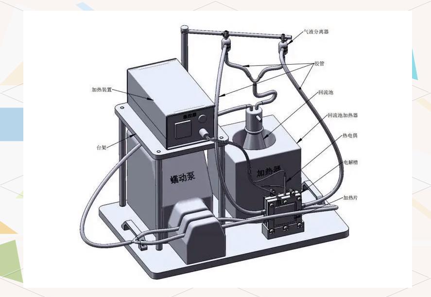 它通过蠕动泵将电解液送至两侧极板,使其经过流道并接触到阴阳电极,从而在阴极发生析氢反应,在阳极发生析氧反应。反应后的电解液和气体混合物通过气液分离器分离,气体排出,电解液则回流至回流池。此外,控温系统用于加热阴阳极板,以精确控制电解温度。